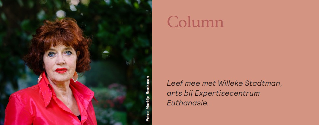 Het is duidelijk, Dora lijdt ondraaglijk en uitzichtloos aan een stapeling van ouderdomsaandoeningen. Dat is de SCEN-arts met ons eens. Dolf heeft geaarzeld, maar hij ís aanwezig bij de uitvoering van de euthanasie. Bij verrassing heeft hij een familielid uit Canada meegenomen. De sfeer is om te snijden. Dora in haar stoel, en een zoon die haar compleet negeert. Als ik vraag of ze wil gaan, knikt ze. Rob legt een hand op haar hoofd. Troost van een vreemde. | | | | | | ‘Ik wilde het werk niet volledig loslaten.’ | | |  Oud-verpleegkundige Ellen Rentema over haar nieuwe rol als bestuurslid van Stichting Vrienden van Expertisecentrum Euthanasie.